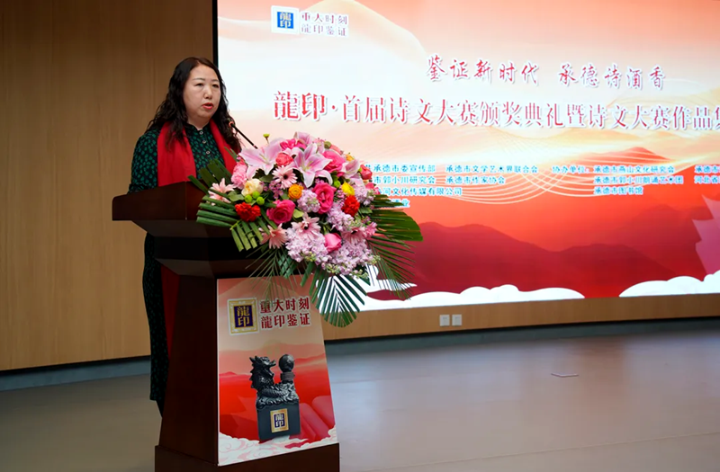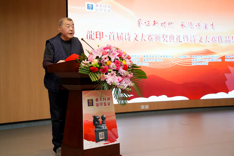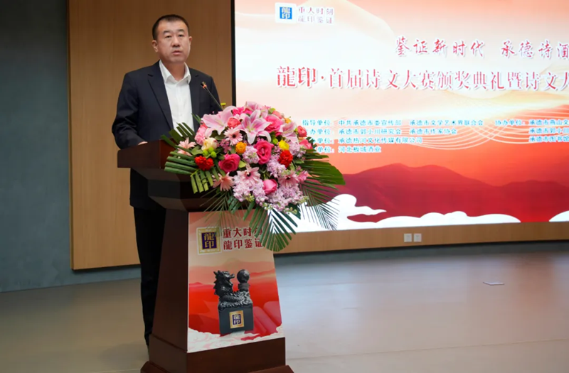 承德市郭小川研究會會長步九江發(fā)表致辭,“鑒證新時代 承德詩酒香——龍印·首屆詩文大賽”這場活動參與人員之多,高手云集之密,采訪挖掘之深,作品質(zhì)量之高,在承德文學(xué)史上尚屬首次。