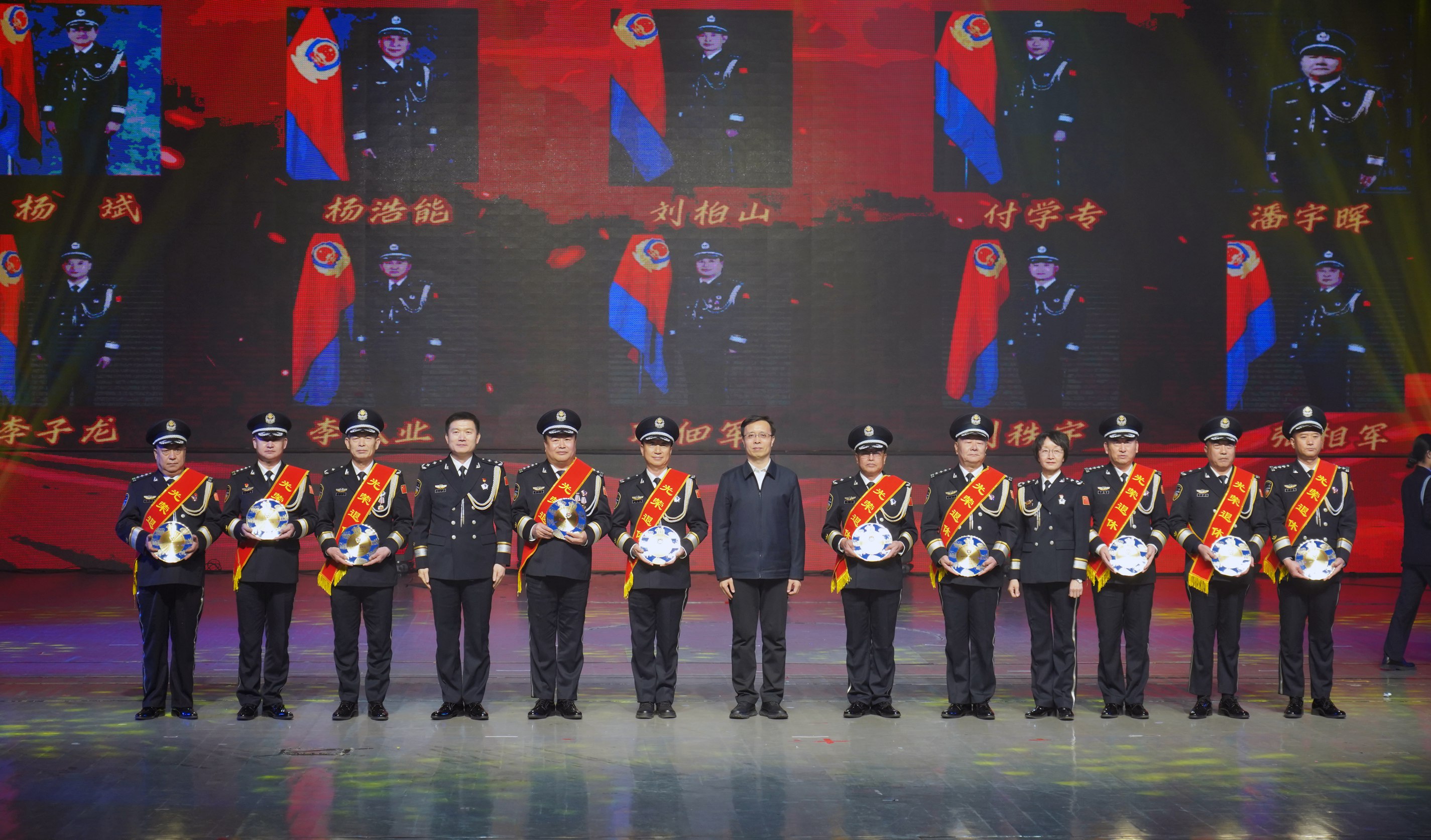 市委副書記、市長王亞軍,市人大常委會主任劉文勤,市政協(xié)主席吳清海,為榮立個人二等功民警頒獎