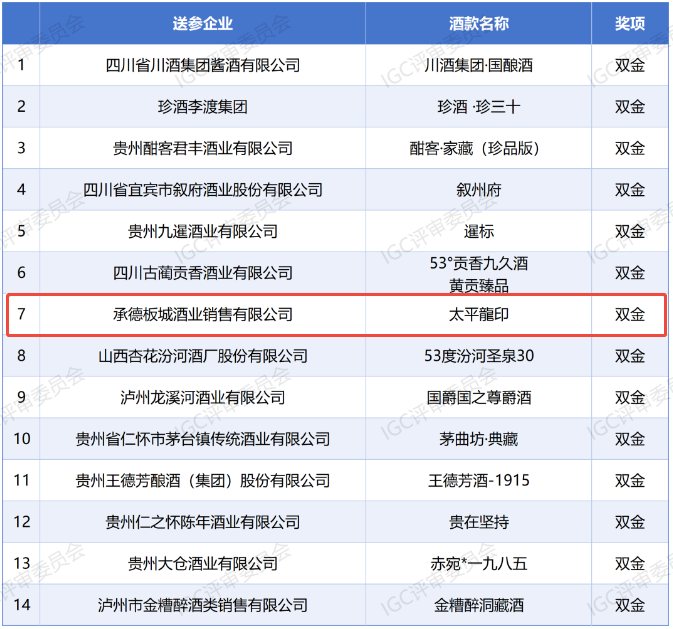 近日,2025年IGC國際烈酒(香港)大賽獲獎入圍第一批送檢合格名單公布,板城酒業(yè)——太平龍印,憑借卓越的品質(zhì)與柔順的口感,從百款參賽酒品中脫穎而出,一舉斬獲最高獎項——“雙金獎”!