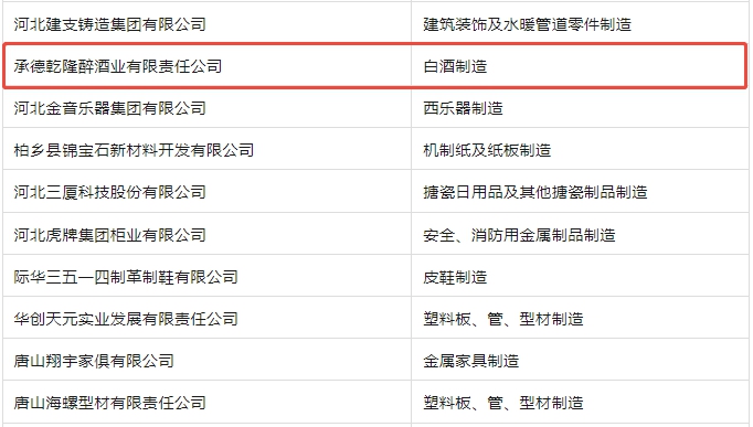 近日,河北省輕工行業(yè)協(xié)會日前發(fā)布了我省2024年度輕工業(yè)50強企業(yè)榜單。三河匯福糧油集團有限公司、君樂寶乳業(yè)集團股份有限公司、今麥郎食品股份有限公司、邯鄲美的制冷設(shè)備有限公司、秦皇島金海糧油工業(yè)有限公司、風(fēng)帆有限責(zé)任公司等企業(yè)位居前列,河北板城酒業(yè)(承德乾隆醉酒業(yè)有限責(zé)任公司)再次實力入選2024年度河北省輕工業(yè)50強企業(yè)榜單。