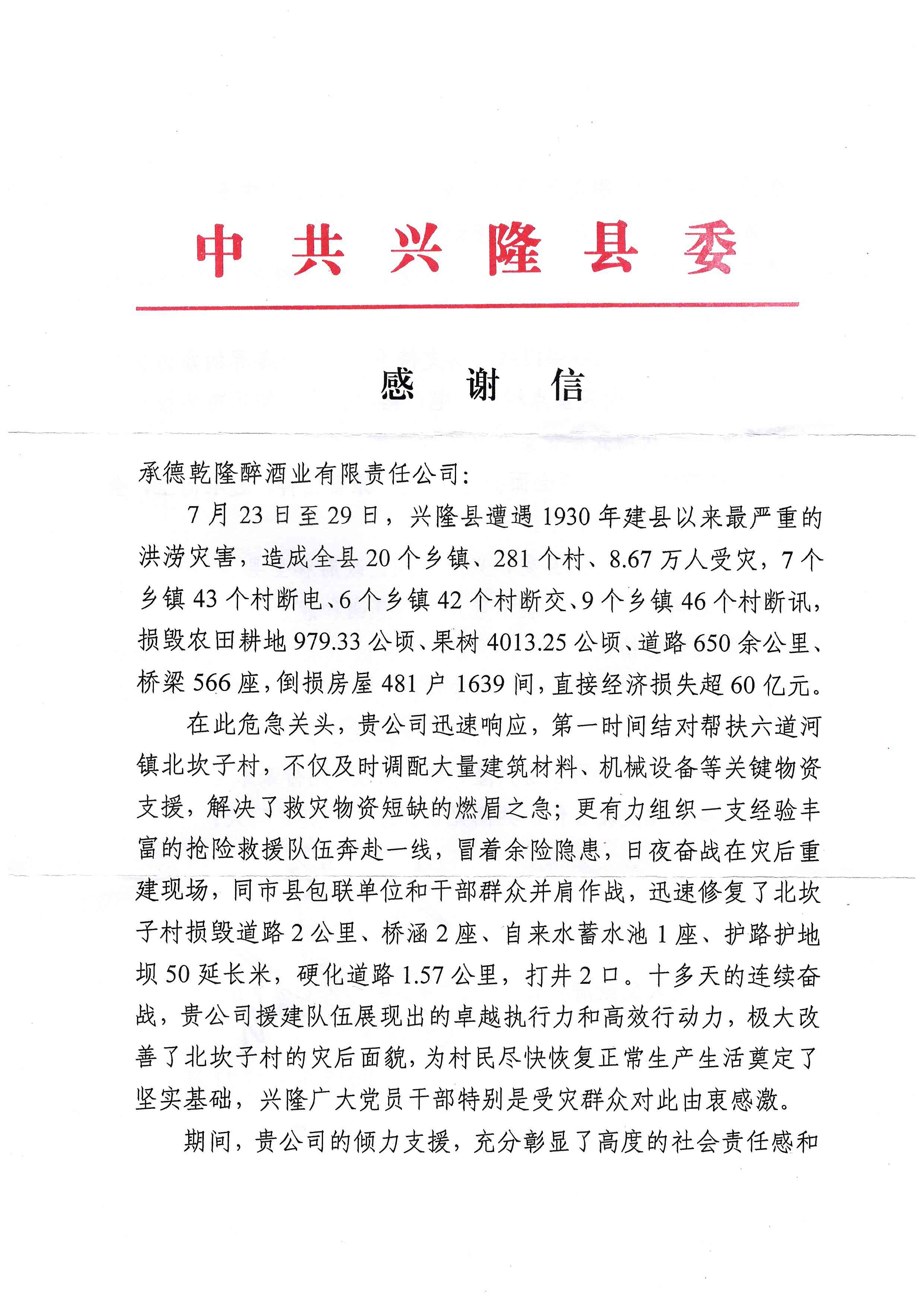 近日,板城酒業(yè)(承德乾隆醉酒業(yè)有限責(zé)任公司)收到中共興隆縣委發(fā)出的感謝信,信中對(duì)板城酒業(yè)在今年7月興隆縣特大洪澇災(zāi)害中的緊急馳援和傾力相助表示高度贊譽(yù)和衷心感謝。