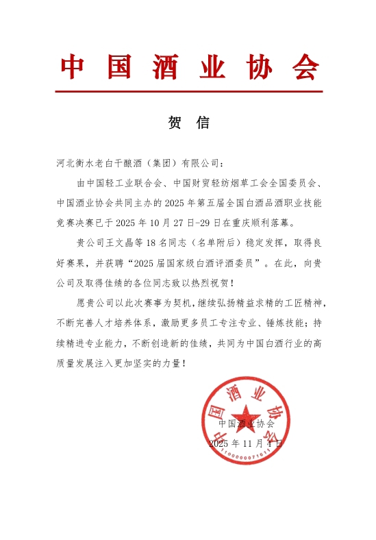 在第五屆全國白酒品酒職業(yè)技能競賽中,衡水老白干及旗下四家子公司18位選手穩(wěn)定發(fā)揮,取得良好賽果,被聘任為“2025屆國家級(jí)白酒評(píng)酒委員”;其中板城酒業(yè)孫玉玲、劉志強(qiáng)、王金萍、敖冉、亓海波5位選手參加比賽,通過比賽斬獲優(yōu)異成績,均被聘任為“2025屆國家級(jí)白酒評(píng)酒委員”。板城酒業(yè)成為河北省除衡水老白干酒業(yè)外最多入選人數(shù)的酒企,其中,敖冉、亓海波兩名選手初次參賽獲聘國家級(jí)白酒評(píng)酒委員。